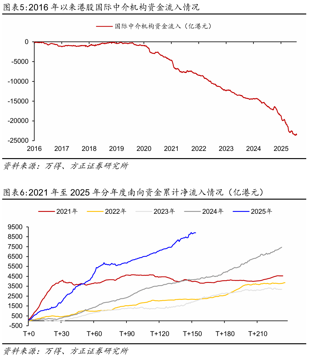 二是外资有望回流。港股的资金结构可以分为外资(国际中介机构)、港资(香港本地中介机构)和内资(中资中介机构和陆股通)。从资金流量上看,2020年以来国际中介机构整体呈净流出态势,且流出斜率在2024年后有所加大(参见图表5)。随着美联储近期偏鸽派的表态以及中美关系的缓和,该行预计外资对港股的资金流量会有所改善。