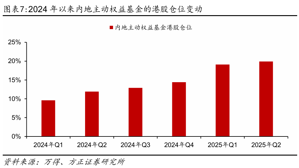 三是南向资金有望持续流入。今年以来南向资金大幅流入港股,年度累计流入规模创近年新高。截至8月22日,南向资金年内累计流入金额已达到8910.9亿元,大幅高于2021年以来的同期水平(参见图表6)。此外,内地主动权益基金对港股的配置比例也在不断增加并创新高,截至2025年二季度,主动权益基金的港股仓位已经来到了19.9%(参见图表7)。