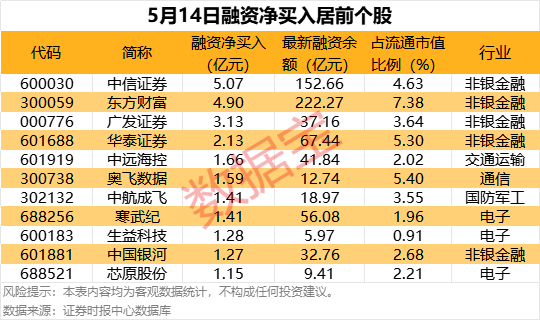 具体到个股,5月14日共获融资净买入千万元以上的有334股,其中11股融资净买入额超1亿元。中信证券融资净买入额居首,当日净买入5.07亿元;其次是东方财富、广发证券,融资净买入金额分别为4.90亿元、3.13亿元;融资净买入金额居前的还有华泰证券、中远海控、奥飞数据等。