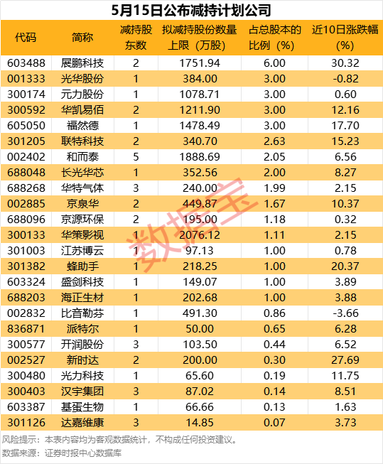 5月15日,共24家公司公告股东减持计划,拟减持比例居前的有展鹏科技、光华股份、元力股份等。