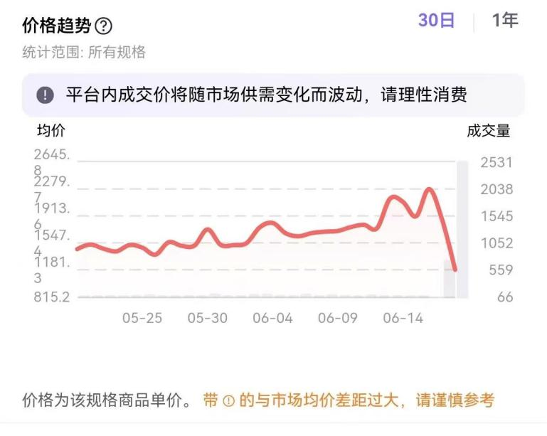 以千岛App上的“前方高能”系列Labubu挂件为例,其成交均价自6月16日起应声“腰斩”,从前一日的2279.7元迅速跌至1181.3元。价格的暴跌,瞬间引爆了市场的交易热情:该系列在17日前的日均成交量不足66个,17日便激增至559个,18日成交量更是再度飙升近四倍,高达2531个。