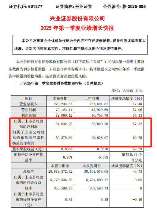 兴业证券公告称,公司一季度实现营业收入27.92亿元,同比增长17.48%;实现归属于上市公司股东的净利润5.16亿元,同比增长57.32%。