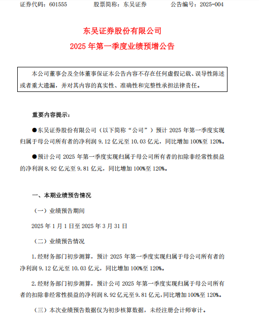 东吴证券公告称,经财务部门初步测算,预计2025年第一季度实现归属于母公司所有者的净利润9.12亿元至10.03亿元,同比增加100%至120%。
