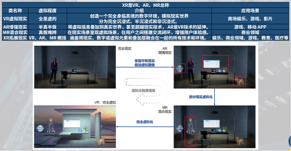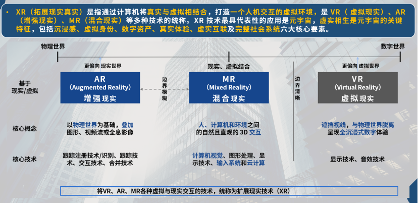 XR(拓展现实真实)是指通过计算机将真实与虚拟相结合,打造一个人机交互的虚拟环境,是VR(VirtualReality虚拟现实)、AR(AugmentedReality增强现实)、MR(MixedReality混合现实)等多种技术的统称。