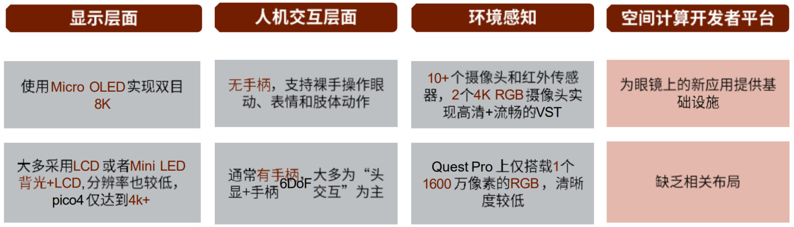 苹果VisionPro:以显示、交互技术升级切入空间计算,追求极致性能。产品支持面部追踪+全身渲染,头显可以通过十数颗摄像头与传感器追踪面部表情与身体动作,从而在FaceTime软件中逼真地渲染用户的面部和全身,用户将会感觉自己和同伴都处在同一个“房间”。