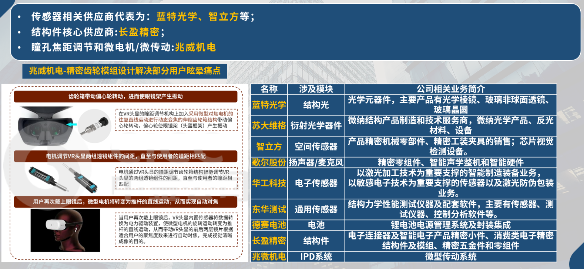1)机械式可变焦:有效解决VAC眩晕问题,通过电机和精密齿轮模组实现焦距与瞳距调节,目前MR设备多为瞳距调节,预计随着焦距调节的引入,机械式可变焦设备的单体价值量或将翻倍。