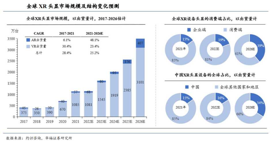 国内VR服务市场发展迅速,未来中国头显出货量有望持续增长。中国VR、AR市场规模从2017年的160亿元增长到2022年的775.9亿元,CAGR为37.13%,中国已成为全球第二大VR、AR市场,且2021年以来下游市场娱乐占比超50%;2022年全球XR头显设备出货量达到1149万台,其中VR出货量为1081万台,占整个XR出货量的94.08%,2022年中国XR头显设备出货量约占全球的16%,随着国产头显设备厂商的扩增和国产替代的趋势,根据共研产业研究院数据,预计2025年中国XR的出货量占比有望超25%。