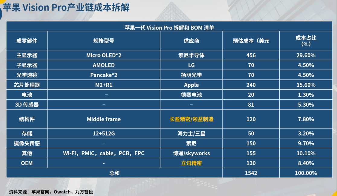 XR软件端缺乏“杀手级”应用场景,硬件端存在成本、重量和眩晕等问题,一定程度上限制了XR销量徘徊在千万台级别,随着苹果MR新产品陆续推出,2024、2025年苹果MR设备出货量有望放量突破瓶颈。VisionPro已量产,预计2024年1月首周开始大量出货,Apple可能将在1月底或2月初发售VisionPro。MR正在孕育成为科技板块新主线,消费级MR预计将成为下一代计算平台,苹果VisionPro供应链涉及芯片、光学、声学、屏幕、结构件、产线设备等多项环节,苹果VisionPro有望突破硬件体感临界点,引爆MR产业链级机会(硬件+应用端)。VisionPro硬件成本高达1640美元,其中前沿技术MicroOLED屏幕成本占比较高,占总成本约42%。此外供应链中涉及的较为重要的新技术还包括机械式可变焦技术。