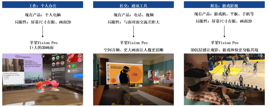 VisionPro:相比其他XR产品应用场景围绕游戏、观影,苹果MR强调其产品娱乐+社交+生产力工具定位。