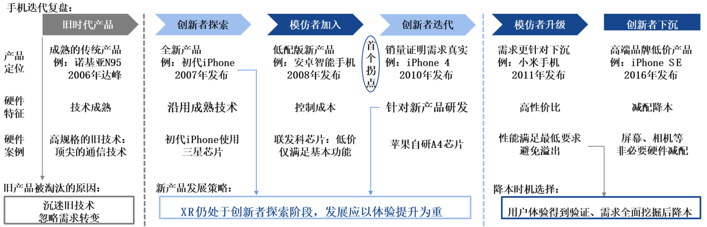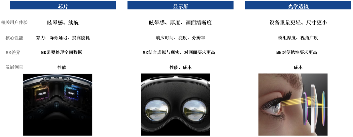 MR设备屏幕大、展示三维内容,性能上优于现有设备;同时相比电视、显示器等较难移动的固定设备,MR头显更便携灵活,具备计算平台进化所需条件。MR发展仍处探索期,用户需求挖掘未全面、硬件技术未成熟,发展侧重体验而非降本;苹果MR强调用户体验、突破性功能的策略更易胜出。