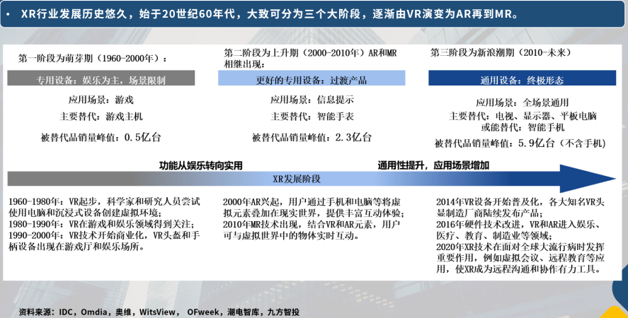 XR产业始于20世纪60年代,科技巨头公司持续布局XR产业。XR行业始于20世纪60年代,逐渐由VR演变为AR再到MR,目前扩XR适用于各行各业,如医疗保健、教育、建筑和工程、旅游、零售、娱乐等。目前市面上较为流行的智能手机、平板电脑、PC、终端设备等都是提供的一种平面的视觉体验(2D),3D视觉体验逐渐受到关注,从2D到3D的突破离不开XR行业的发展,科技巨头已经陆续布局XR产业,包括Meta的Quest系列产品以及苹果的AR/VR头显设备等。