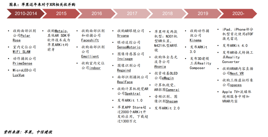 苹果通过收购相关企业深入方方面面布局AR领域。近些年苹果动作频频,根据不完全统计,近年来苹果收购VR/AR相关的企业多达几十家,包括3D感应以及动作捕捉技术公司PrimeSense、MicroLED公司LuxVue、动捕公司Faceshift、面部识别公司Emollient、硅基OLED公司eMagin、体全息光波导公司Akonia等,在光机、显示、动捕、面部识别、建模、内容方面均有深度布局。