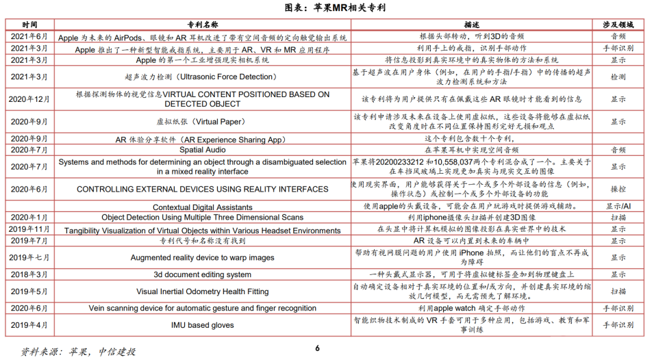 苹果自从2010年开始,即为AR/VR(HMD头戴式显示设备)积累了大量专利。其中包括显示类、扫描类、手部识别、眼球追踪、音频、导航、监测、AI算法、操控、识别等多方面技术。