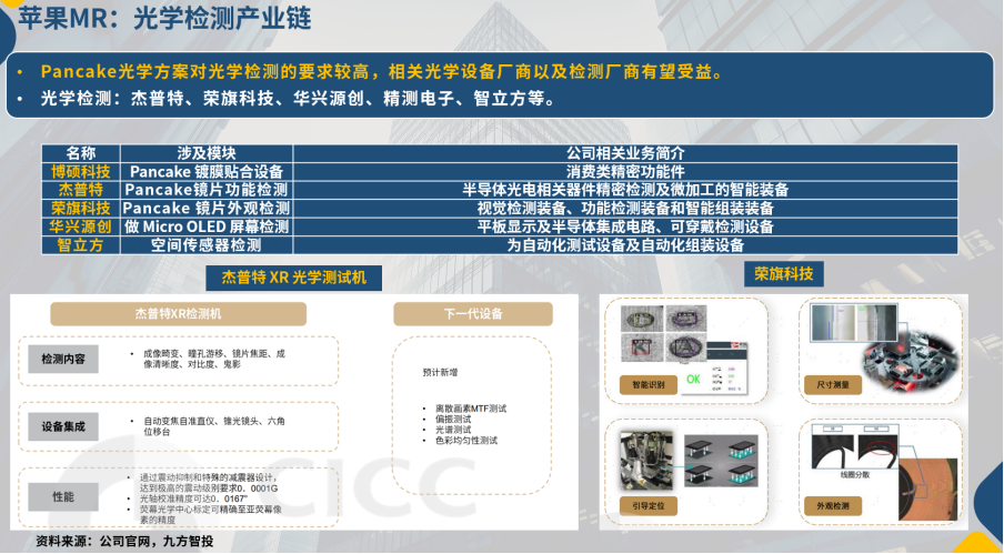 随着苹果、Meta等厂商MR头显产销量的增加,对设备的检测需求或将增加,光学检测公司包括杰普特、华兴源创、荣旗科技、智立方等。