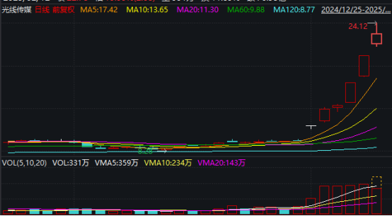 在光线传媒大涨的带动下,传媒娱乐板块多只股票大涨,华数传媒、横店影视涨停;贵广网络盘中一度涨停,截至午间收盘涨8.04%;华谊兄弟盘中涨幅超过12%,目前涨超6%;果麦文化盘中涨幅超过10%,目前涨超7%;万达电影、博纳影业盘中涨幅超过8%,目前涨幅仍在4%以上。
