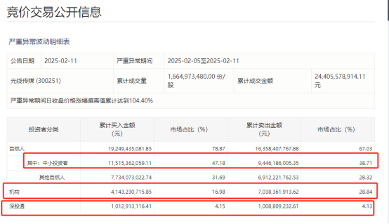 深交所2月11日披露的竞价交易公开信息显示,在2025年2月5日至2025年2月11日股价严重异常波动期间,光线传媒中小投资者累计买入占比47.18%,累计卖出占比38.71%;相较之下,上述时间区间内,机构累计买入占比16.98%,累计卖出占比28.84%。