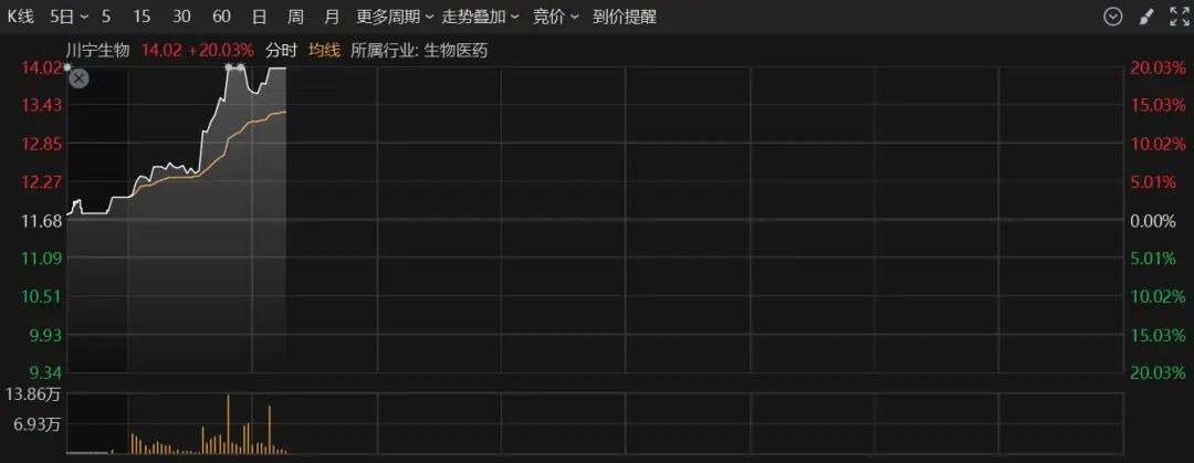 合成生物概念集体拉升,截至发稿,川宁生物拉升20%涨停,拓新药业也拉升大涨超10%,金达威、蔚蓝生物、福瑞达等涨幅居前。