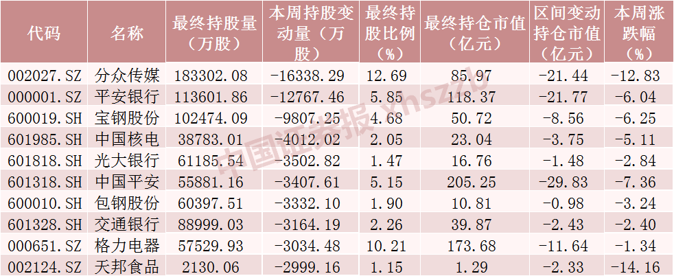 从市场表现看,本周北向资金减仓股数居前十的股票均下跌,天邦食品跌幅最大,一周下跌14.16%。