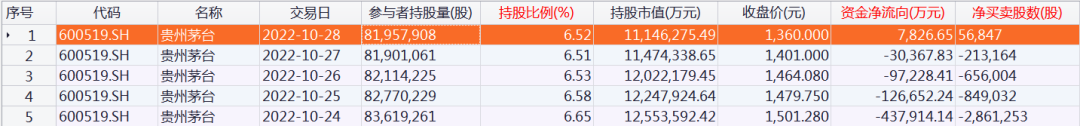 从成交均价和减仓股数来计算,贵州茅台为本周北向资金减仓金额最高的个股,被减仓452.26万股,金额达68.43亿元。从明细数据来看,本周北向资金前4个交易日均减仓贵州茅台,其中10月24日减仓逾40亿元。