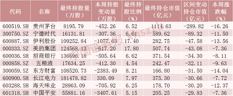 从市场表现看,本周北向资金持仓市值减少额居前十的股票均下跌,贵州茅台跌幅最大,本周下跌16.26%。