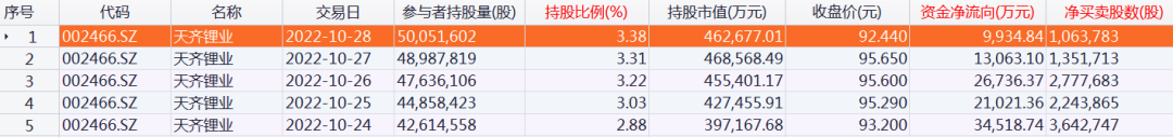 Choice数据显示,截至10月28日,北向资金持有天齐锂业5005.16万股,天齐锂业股价为92.44元/股。