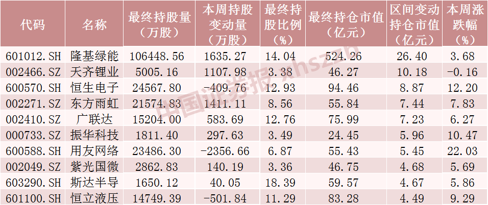 本周北向资金持仓市值增加额居前十的股票中,除恒生电子、用友网络、恒立液压被分别减仓409.76万股、2356.66万股、501.84万股外,其他股票均被北向资金加仓,其中对隆基绿能、天齐锂业、东方雨虹的持股增加数超1000万股。