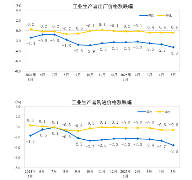 2025年5月份,全国工业生产者出厂价格同比下降3.3%,环比下降0.4%;工业生产者购进价格同比下降3.6%,环比下降0.6%。1—5月平均,工业生产者出厂价格和购进价格比上年同期均下降2.6%。