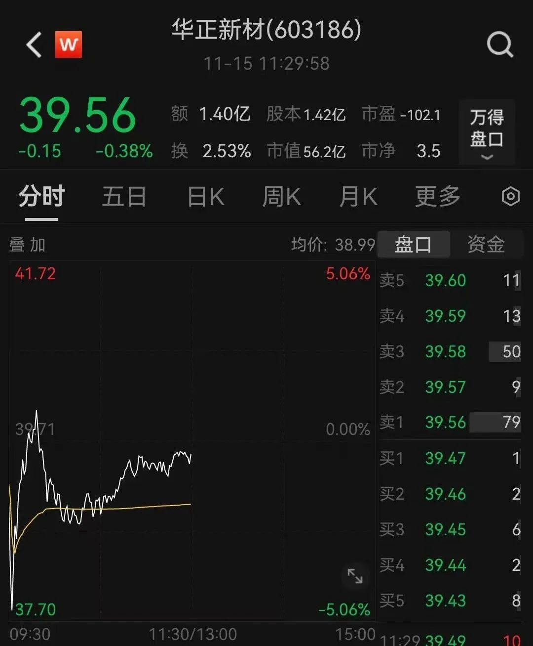 截至11月15日上午收盘,华正新材股价报39.56元/股,跌0.38%,总市值约56亿元。