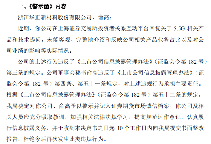 浙江证监局在警示函中指出,华正新材在互动平台回复关于5.5G相关产品和技术提问,未能客观、完整地介绍和反映公司相关产品业务占比以及对公司业绩的影响等实际情况,违反《上市公司信息披露管理办法》多条相关规定,公司董事会秘书俞高对违规行为承担主要责任。