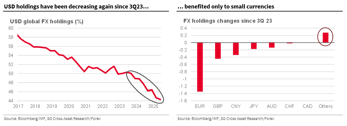 正如法国兴业银行图表所演示的,自2024年以来,去美元化进程并未如预期般使任何其他主要储备货币大为受益——在法定货币体系中,一种货币的损失本应会导致另一种货币获益。相反,黄金的份额在此期间则反而明显增加。