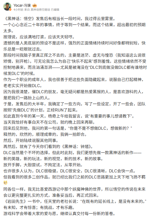 黑神话宇宙开启!游戏科学不做“猴”了?创始人冯骥发文回应