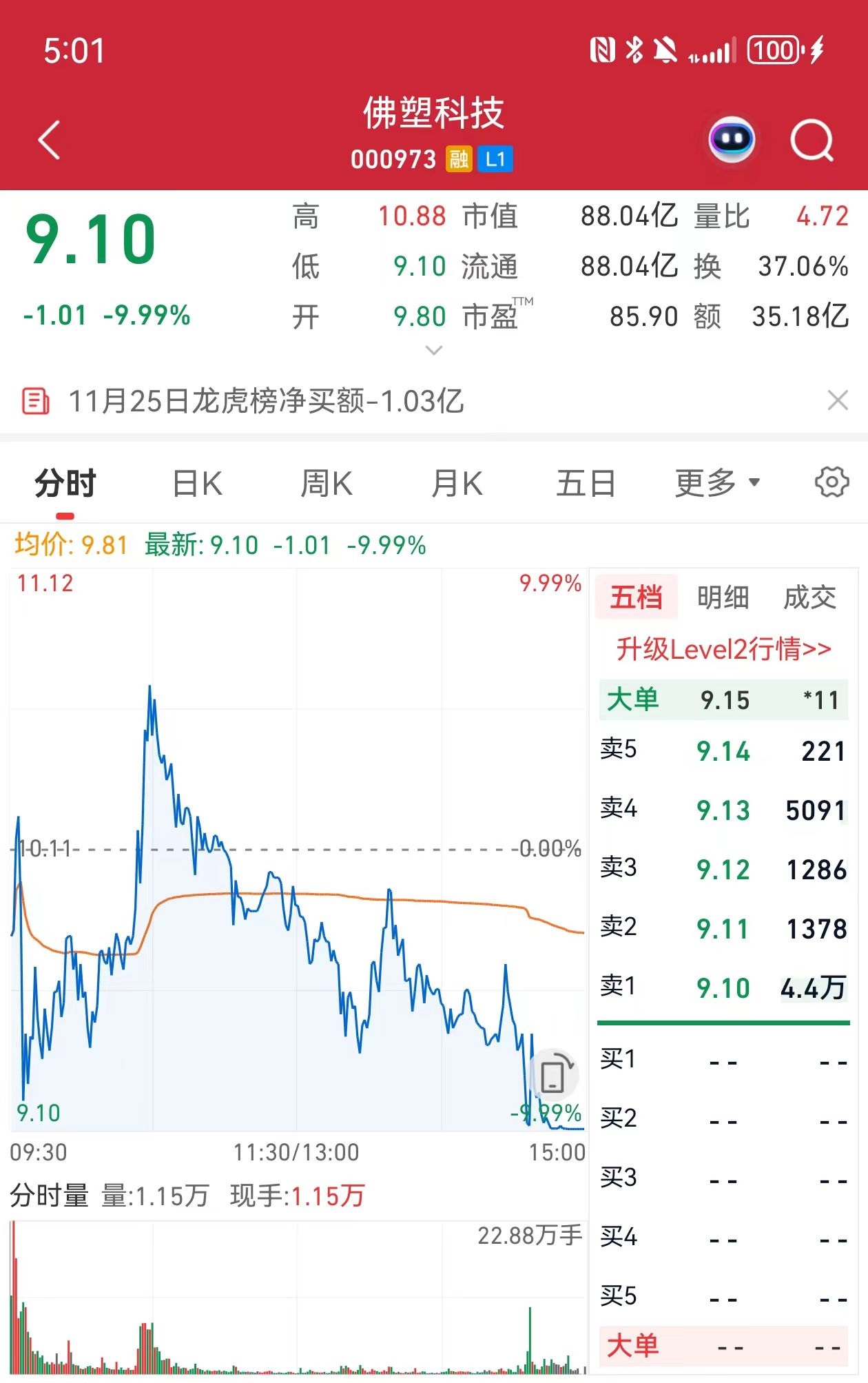 具体看,今日开盘,佛塑科技一度低开,在10:30左右一度冲高,涨幅超过5%,总市值突破105亿元。此后,佛塑科技股价急剧下挫,临近尾盘股价触及跌停,并有超过4万手的封单。以9.10元的收盘价计算,公司总市值降低至88.04亿元。