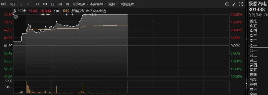 汽车产业链早间全线走强,其中豪恩汽电大幅拉升20%涨停。