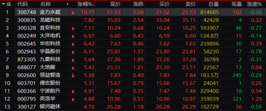 午后开盘,稀土永磁概念股直线拉升。金力永磁涨超10%,龙磁科技、正海磁材、德宏股份涨超5%,银河磁体、中科三环、大地熊、宁波韵升、英洛华等跟涨。