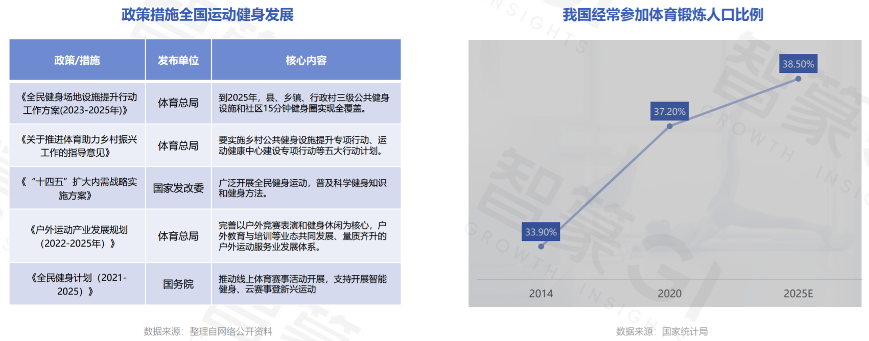 近年来,国家发改委、国家体育总局等部门制定并发布多项政策举措,推动完善健身行业发展。我国体育行业迎来黄金时代,获得飞速增长。广大群众的体育健身意识不断增强,我国经常参加体育锻炼人数逐年增加,预计2025年经常参加体育锻炼人数比例将达到38.5%。