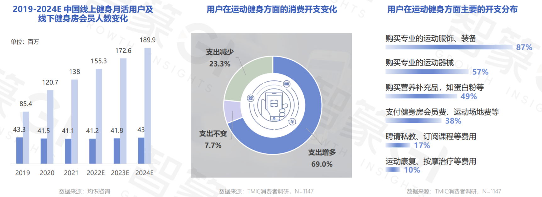 线上运动健身用户日益活跃,运动健身消费意愿度提升,运动服饰、器械是主要消费诉求