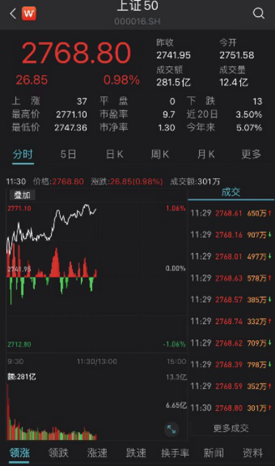 今天上午,上证50指数上涨0.98%,创2022年11月1日反弹以来新高。