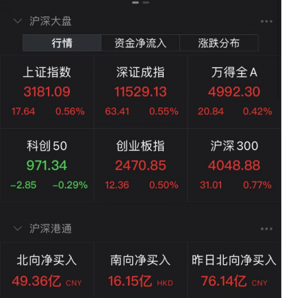 昨天大买90多亿元后,今天上午,北向资金继续扫货,净流入49.36亿元。截至上午收盘,上证指数上涨0.56%,深证成指上涨0.55%,创业板指上涨0.50%。