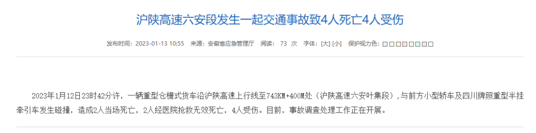 据安徽省应急管理厅消息,2023年1月12日23时42分许,一辆重型仓栅式货车沿沪陕高速上行线至743KM+400M处(沪陕高速六安叶集段),与前方小型轿车及四川牌照重型半挂牵引车发生碰撞,造成2人当场死亡,2人经医院抢救无效死亡,4人受伤。目前,事故调查处理工作正在开展。