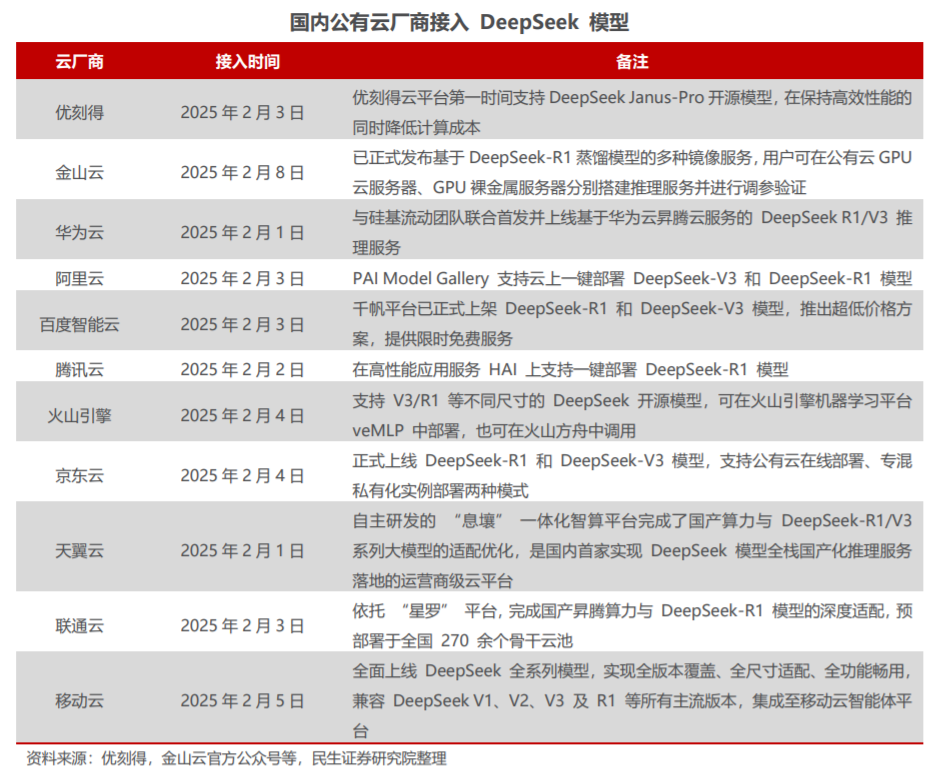DeepSeek开源给予了云服务厂商低门槛部署世界级AI“杀手级应用”,云服务企业又能弥补DeepSeek自身算力紧缺与大规模用户服务部署难题,故云服务厂商市场需求有望迎来广阔机遇。