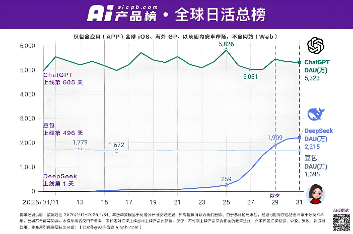 DeepSeek 应用(APP) 2025/01/11 日发布,截止 1/31 日上线仅 21 天,日活跃用户 DAU 2215 万,达 ChatGPT 日活用户的 41.6%,超过豆包的日活用户 1695万。AI 产品榜·全球日活总榜前 3 名分别为 ChatGPT 5323 万,DeepSeek 2215万,豆包 1695 万。