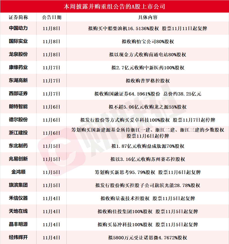 据财联社不完全统计,截至发稿,本周披露并购重组进展的A股上市公司共有17家,分别为中国动力、国际实业、龙泉股份、康缘药业、东湖高新、西部证券、朗特智能、德尔股份、浙江建投、东北制药、兆易创新、金鸿顺、旗滨集团、禾信仪器、天地在线、晶丰明源和经纬辉开。具体情况如下图: