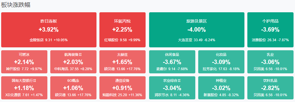 板块方面,环氧丙烷、通信设备、银行、深海科技等板块涨幅居前,旅游、美容护理、乳业、农业等板块跌幅居前。截至收盘,沪指跌0.39%,深成指跌0.31%,创业板指跌0.4%。