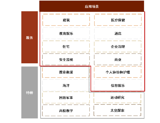 人形机器人的应用主要可以分为两类,普通服务类和特种服务类。普通服务方面,由于人形机器人具有移动性、交互性、智能性的特点,可以为人类承担简单且重复的工作,例如导览、教学、娱乐;特种服务方面,人形机器人可替代人类做更为危险的工作,例如救援及太空探索。