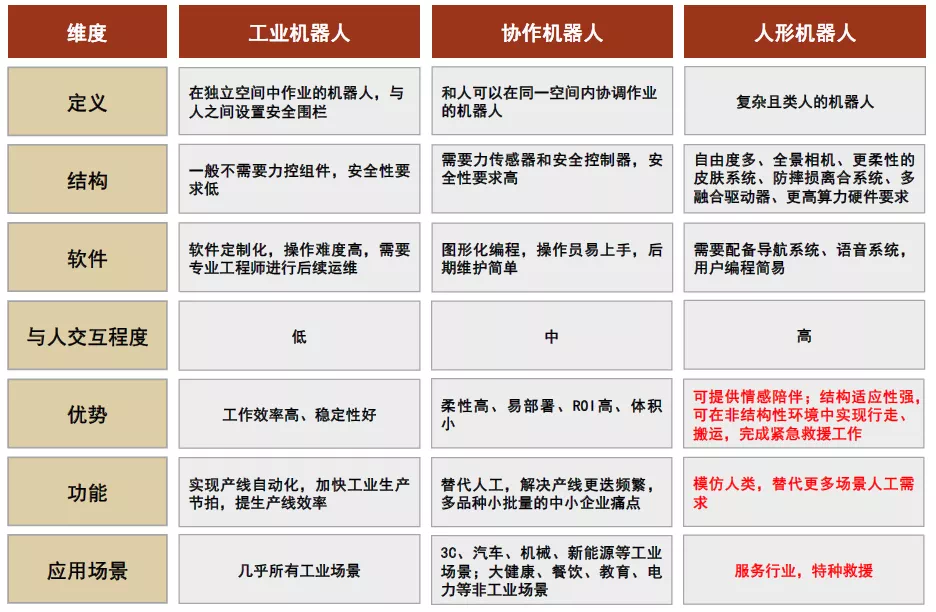图表1 人形机器人与工业机器人、协作机器人区别对比