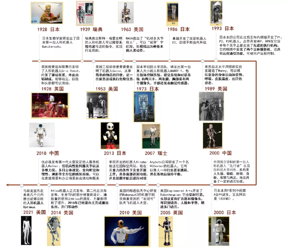中金研究部表示,人形机器人的发展可以分为3个阶段:1)1928年-1973年,初期探索阶段,由欧美及日本主导,研究主要聚焦于人形的结构和驱动,机器人不具备感知和决策功能;2)1973-2013年,系统感知阶段,在“视觉”和“触觉”方面有了较大突破;3)2013年-至今,决策阶段,人形机器人拥有了更强的自主学习和决策能力。