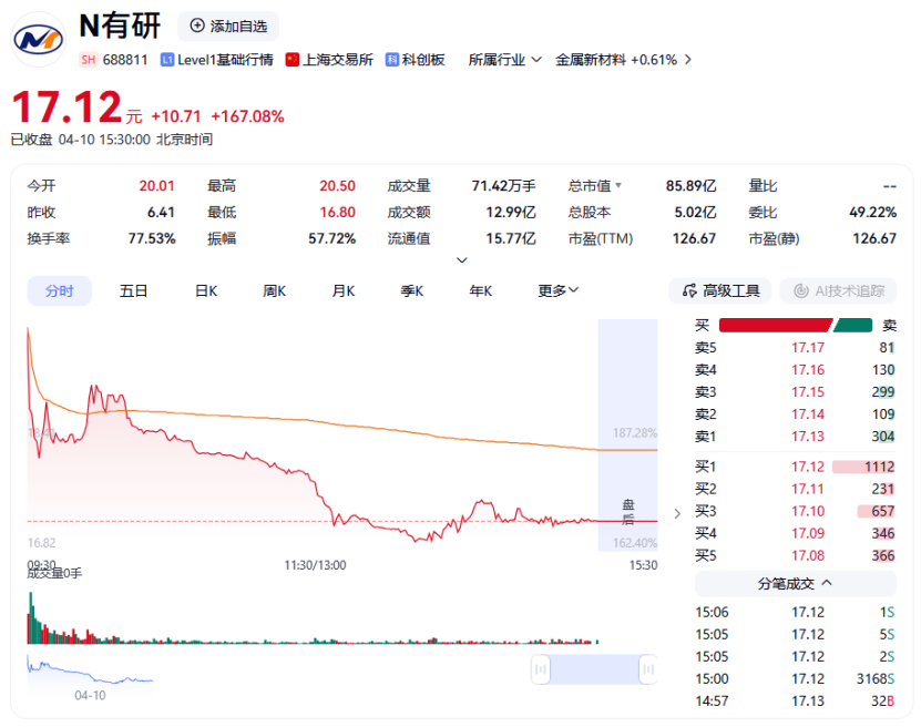 有研复材在上交所科创板上市。截至收盘,该股报17.12元,涨幅167.08%,成交额12.99亿元,换手率77.53%,振幅57.72%,总市值85.89亿元。