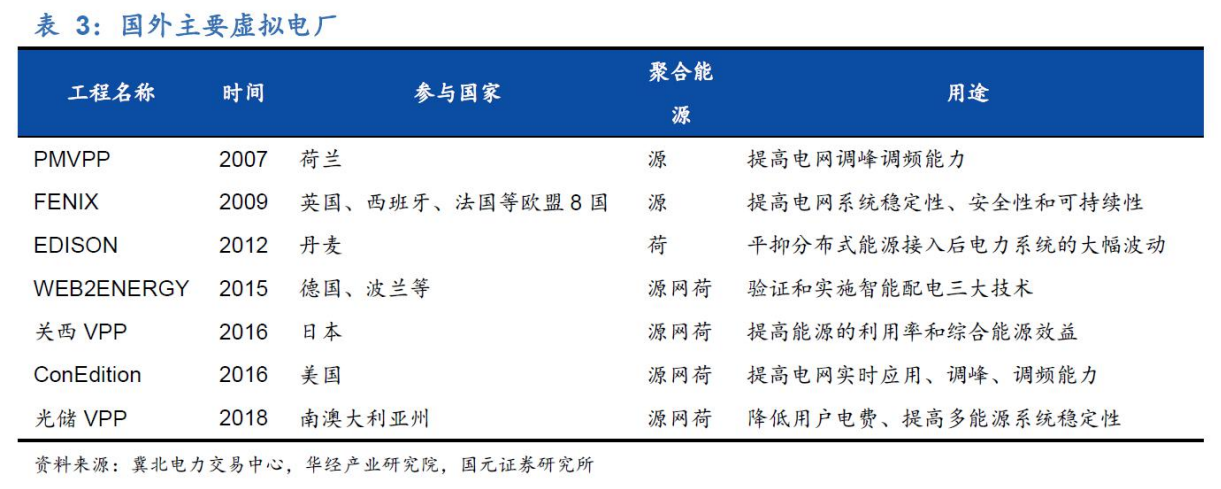 (5)欧美日益成熟,中国奋起追赶。虚拟电厂在欧美发达国家发展较为成熟。在欧美各国已有一些可供借鉴的小规模示范项目。自2001年起,欧洲各国就开始开展以集成中小型分布式发电单元为主要目标的虚拟发电厂研究项目,参与的国家包括德国、英国、西班牙、法国、丹麦等。现已实施的虚拟电厂项目有德国卡塞尔大学太阳能供应技术研究所的试点项目、欧盟虚拟燃料电池电厂项目、欧盟FENIX项目等。