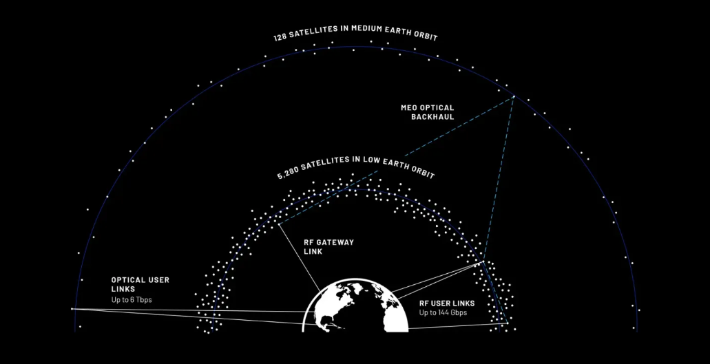在系统设计上,TeraWave采用多轨道设计,其中5280颗部署在低地球轨道上的卫星通过最高144Gbps的常规射频与地面客户通信,另外还有128颗中地球轨道卫星,通过光学链路提供最高6Tbps的双向连接。公司表示,TeraWave的星座部署将于2027年四季度开始。
