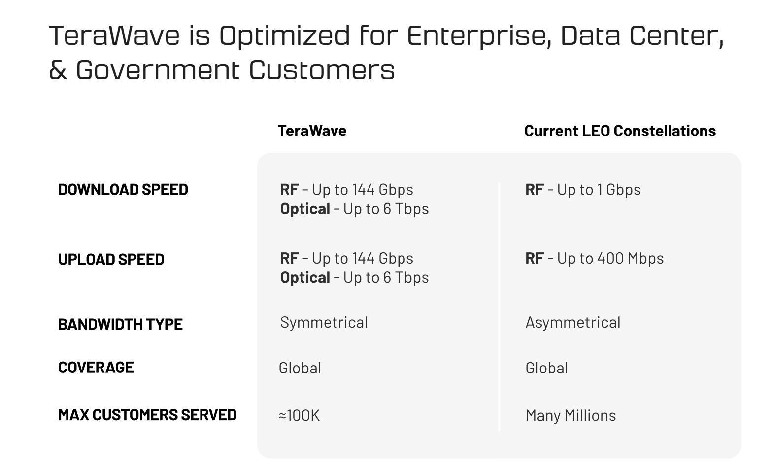通过参数对比也能看出,TeraWave从一开始就瞄准专线级战略通信网络赛道。其上下行对称带宽专门应对需要大量发送数据的场景,例如军事情报的实时传输,或AI训练数据的跨洲同步。